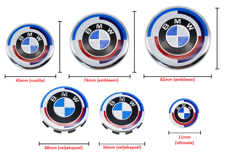 Saadaval embleemid (82mm ja 74mm), kleeps roolile (45mm), veljekapslid (68mm ja 56mm) ning kleeps võtmele (11mm).